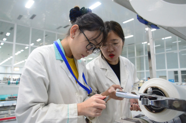 圖為公司工程技術(shù)研究院兩名科研人員,正在進行新纖維開發(fā)試驗。