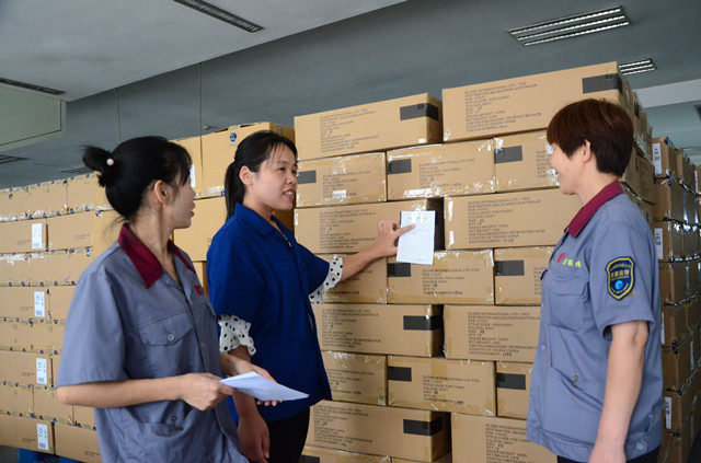 圖為服裝車間計劃管理員陳燕紅(中)在與質量部質檢人員一起,對接即將發(fā)出的出口產品。