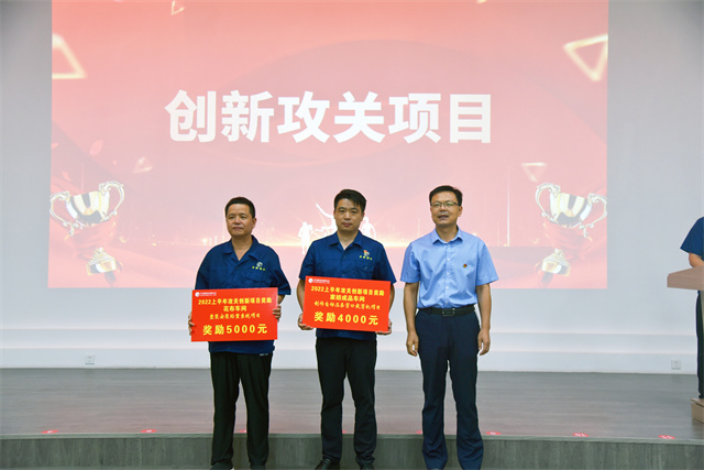 會上,李風明宣讀了公司對2022年上半年度CQI項目、創(chuàng)新攻關(guān)成果等表彰決定;盛守祥為CQI項目代表、創(chuàng)新攻關(guān)一等獎項目代表頒發(fā)獎勵牌,總經(jīng)理閆英山為各車間創(chuàng)新攻關(guān)其他受獎項目代表頒發(fā)獎勵牌,李風明為質(zhì)量之星、效率之星、工藝操作之星受獎代表頒發(fā)榮譽證書,公司安全總監(jiān)孫中然為現(xiàn)場6S之星、精益提案之星受獎代表頒發(fā)榮譽證書。會議由公司團委書記陳冰主持。