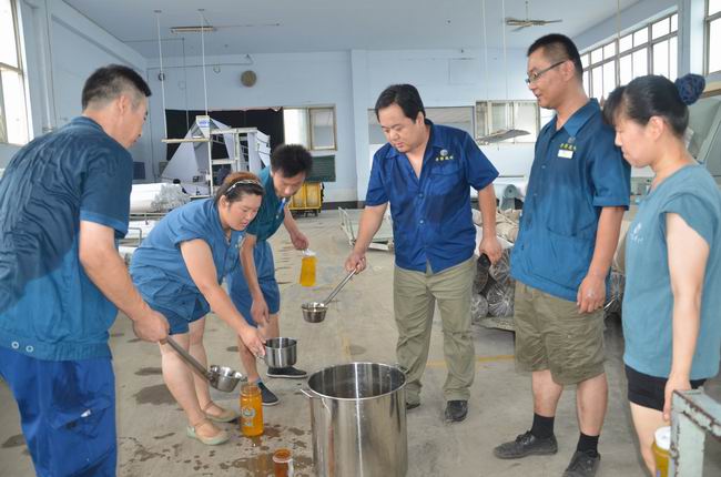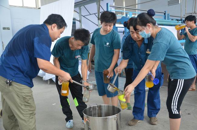 7月29日,當(dāng)日濱州市溫度高達(dá)35℃,華紡股份有限公司管理者將冰好的橘子粉化制飲品到一線生產(chǎn)崗位,一一分發(fā)到正在當(dāng)班的員工水杯中,緩解高溫為員工帶來(lái)的酷熱,送上一份清涼和關(guān)愛。