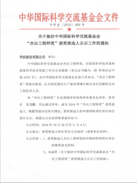 經(jīng)“杰出工程師獎”專業(yè)領域評審組和評審委員會評審,華紡股份有限公司王力民同志通過評審,成為2016年“杰出工程師獎”獲獎候選人。根據(jù)獎勵辦法有關規(guī)定,獲獎候選人的申報材料需所在單位進行公示。公示如下: