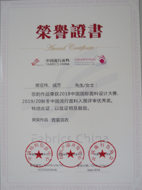 日前,公司在2018年中國國際面料設(shè)計大賽、第40屆(2019/20秋冬)中國流行面料入圍評審中再獲佳績,被授予“2019/20秋冬流行面料入圍企業(yè)”稱號,由席亞偉、戚芳設(shè)計的“霓裳羽衣”面料產(chǎn)品榮獲大賽優(yōu)秀獎。