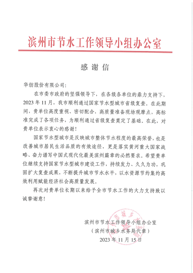 近日,濱州市節(jié)水工作領(lǐng)導(dǎo)小組辦公室向公司發(fā)來(lái)一封感謝信,信中指出:“2023 年11月,我市順利通過(guò)國(guó)家節(jié)水型城市省級(jí)復(fù)查。在此期間,貴單位高度重視、密切配合,高質(zhì)量準(zhǔn)備現(xiàn)場(chǎng)觀摩點(diǎn),高標(biāo)準(zhǔn)完成了各項(xiàng)任務(wù),為順利通過(guò)省級(jí)復(fù)查奠定了基礎(chǔ)。”
