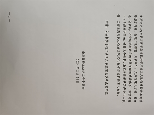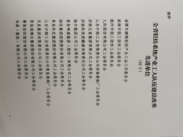近日,省輕工紡織工會三屆四次全委會暨全省輕紡系統(tǒng)產(chǎn)業(yè)工人隊伍建設改革推進會議在濟南召開。會上公布了全省輕紡系統(tǒng)產(chǎn)業(yè)工人隊伍建設改革先進單位名單,公司工會委員會名列其中。