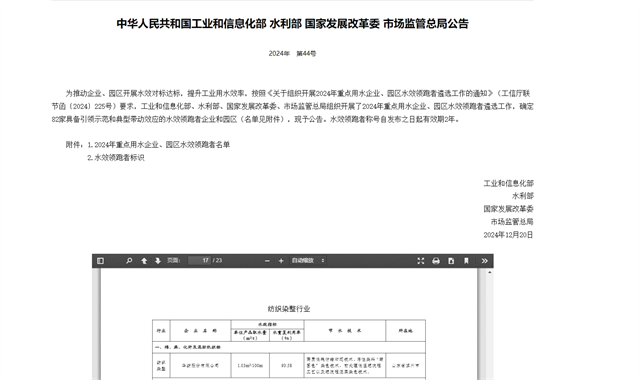 日前,國家工信部、水利部、發(fā)展改革委、市場監(jiān)管總局等四部門聯(lián)合公示了“2024年重點(diǎn)用水企業(yè)、園區(qū)水效領(lǐng)跑者名單”,公司成功入選國家級重點(diǎn)企業(yè)水效領(lǐng)跑者。