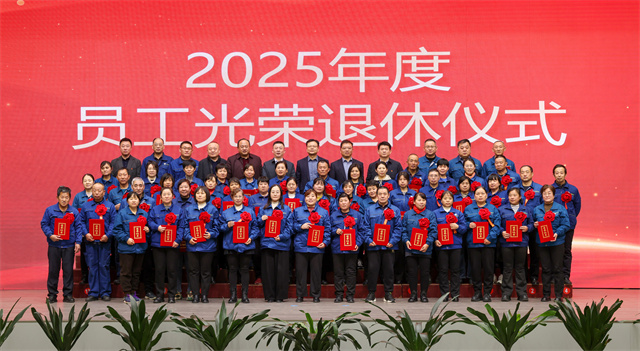 會議為2025年度退休員工舉行光榮退休儀式。公司黨委委員、紀(jì)委副書記、副總經(jīng)理孫玉濤宣讀退休員工名單,黨委書記、董事長盛守祥為退休員工代表頒發(fā)榮譽證書。退休員工代表王立松作為退休職工代表發(fā)言,深情訴說數(shù)十載與公司同行的點滴,誠摯送上對公司的衷心祝福。